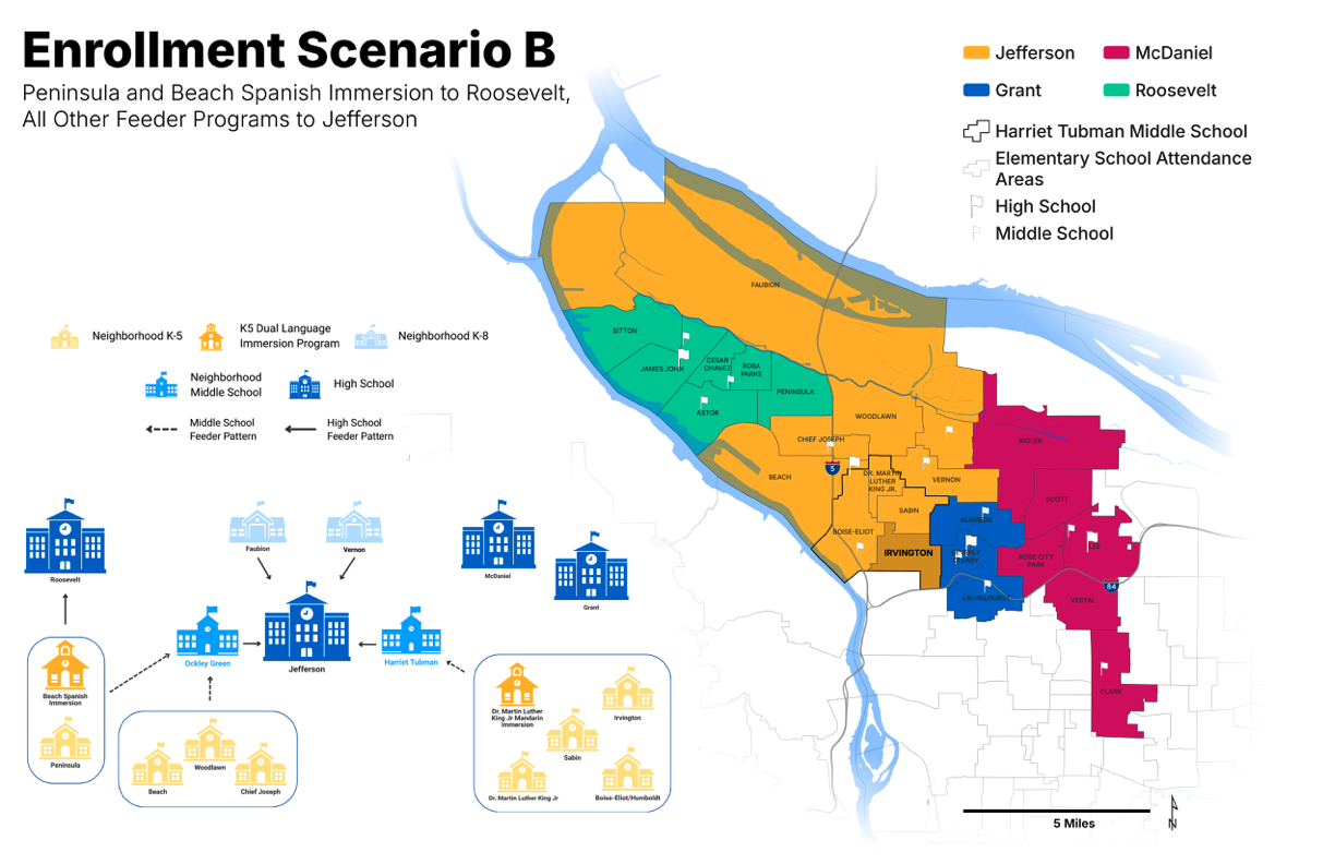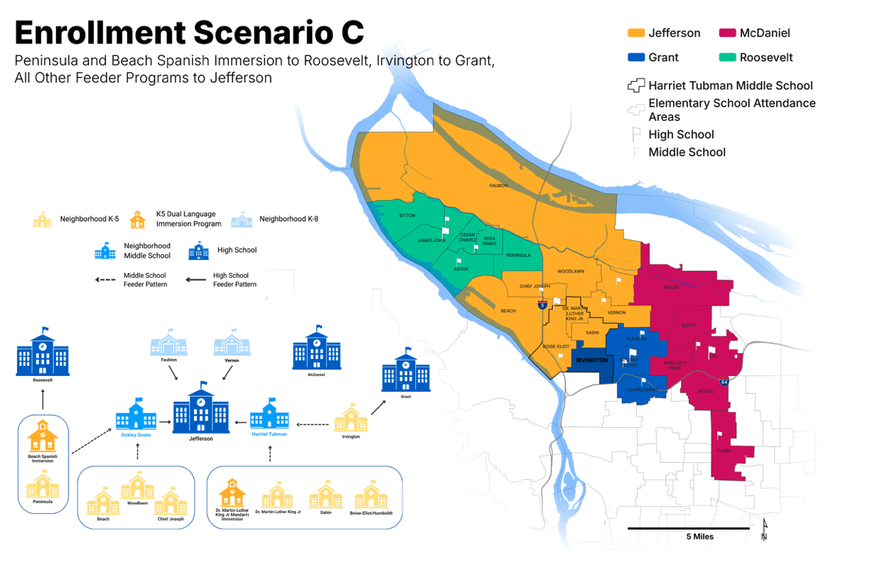 All proposed scenarios will affect all PPS students who attend schools that feed into Harriet Tubman Middle School (HTMS) — Irvington, Sabin, King, and Boise-Eliot/Humboldt — as well as schools that feed into Roosevelt and McDaniel high schools.